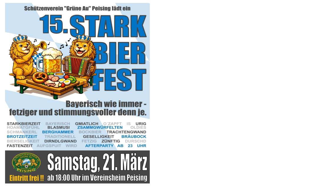 Der Schützenverein „Grüne Au“ Peising lädt herzlich zum 15. Starkbierfest ein.